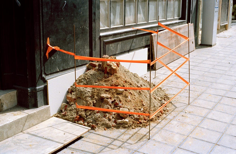 Assis dans le fauteuil de Z., les bras posés sur son bureau, autour de moi les murs sur lesquels elle accroche dessins, tissus, objets divers, enveloppé dans sa veste en jean (moi qui n’en porte jamais !) pendant qu’un avion la transporte à l’autre bout du monde. Je pourrais rester là toute la journée sans plus penser, sans rien faire d’autre que regarder l’espace de l’atelier devant moi, et par la fenêtre le terrain vague, les peupliers et les immeubles d’en face. Mais aussi insouciant que je sois, inactif, immobile, je me retrouve toujours à formuler une phrase sans même m’en rendre compte (« Assis dans le fauteuil de Z., les bras posés sur son bureau… »).